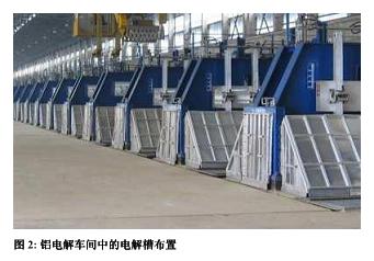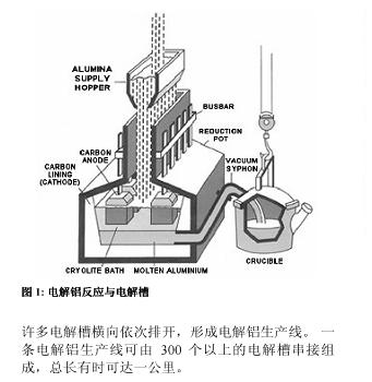 電解槽為大而淺的鋼槽,內(nèi)側(cè)襯有碳層,不同電解槽在電氣上為串聯(lián)連接。每個電解槽中,直流電流經(jīng)石墨陽極流入呈融化狀的氧化鋁電解液,然后經(jīng)電解槽內(nèi)襯的碳陰極流出,進(jìn)入下一電解槽的陽極,依次類推。在電流的作用下,氧化鋁中的氧元素被分離出來,并在電解槽上部與碳化合形成二氧化碳,而在電解槽底部析出液態(tài)的鋁。以上生成過程見圖1。