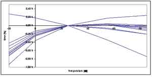 為了在各種溫度變化下獲得更好的性能,愛特梅爾增加了一個額外的基準(zhǔn)電壓校準(zhǔn)機(jī)制,用以調(diào)節(jié)帶隙基準(zhǔn)源的溫度系數(shù)。這個校準(zhǔn)步驟將調(diào)節(jié)曲率的形狀和位置,并顯著改善隨溫度變化的穩(wěn)定性,如圖4所示,在-20~+85℃溫度范圍內(nèi)的最大變化是0.5%。注意第二個校準(zhǔn)步驟可以檢測和顯示出具有截然不同的曲線形狀的離群點(diǎn)。