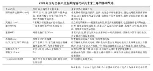 2009年,世界主要IT企業(yè)為應(yīng)對(duì)國(guó)際金融危機(jī),紛紛通過(guò)并購(gòu)戰(zhàn)略整合優(yōu)勢(shì)資源,開(kāi)拓新興市場(chǎng),實(shí)施產(chǎn)品多元化發(fā)展,從而提升行業(yè)戰(zhàn)略地位和自身的競(jìng)爭(zhēng)力。未來(lái)3年這種發(fā)展態(tài)勢(shì)仍會(huì)繼續(xù)。