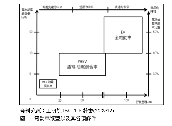 2009年車用鋰電池目前佔(zhàn)整體鋰電池應(yīng)用約1%市場(chǎng)比重很小,使用到電池做為電力系統(tǒng)的電動(dòng)車型態(tài)包括HEV、PHEV、EV,這三種車輛可行駛的里程以及對(duì)於電池容量的要求如圖1。對(duì)於電池能量的需求、一次充電後可行駛的里程以及電池組佔(zhàn)整車成本的比重都是EV>PHEV>HEV,當(dāng)然EV是最理想的電動(dòng)車型態(tài),但是以目前的電池材料技術(shù)尚難以達(dá)到,所以電動(dòng)車的發(fā)展也仍然必需循序漸進(jìn)的進(jìn)行。由使用電池?cái)?shù)量較少的HEV先用,再逐步擴(kuò)展到EV市場(chǎng)。