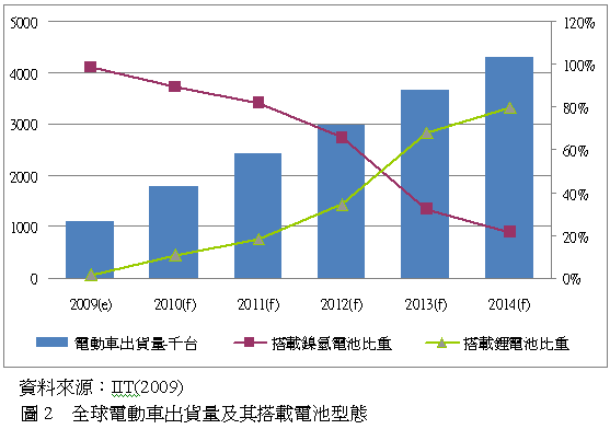 2009年全球汽車出的出貨量約為6300萬(wàn)臺(tái),當(dāng)中電動(dòng)車出貨量約為110萬(wàn)臺(tái),目前電動(dòng)車市場(chǎng)份額小,而且以鎳氫電池為主,不過(guò)在鋰電池持續(xù)的發(fā)展下相當(dāng)有機(jī)會(huì)在2013年就取代鎳氫電池成為電動(dòng)車用電池的主要電池型態(tài)。依照IIT在2009年的預(yù)估,全球的電動(dòng)車用電池型態(tài)在2012年就會(huì)有很明顯 的改變,到2012年鎳氫電池約佔(zhàn)全球電動(dòng)車比重的六成五、鋰電池佔(zhàn)三成五,到2013年就會(huì)出現(xiàn)黃金交叉點(diǎn),鋰電池佔(zhàn)全球電動(dòng)車比重的六成八、鎳氫電池 佔(zhàn)三成二,顯示隨著時(shí)間的經(jīng)過(guò)鋰電池的安全性以及電容量得到實(shí)證的支持,會(huì)讓鋰電池的飛輪在未來(lái)快速起飛,如圖2。