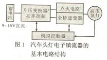 為了滿足燈在啟動與穩(wěn)態(tài)時的不同要求,目前,一般采用的汽車頭燈用電子鎮(zhèn)流器的基本電路結(jié)構(gòu)包含圖1所示的4部分功能。