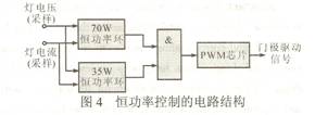 由圖3可知,全橋逆變電路的總體負載只有燈消耗有功功率,因此燈消耗的功率可近似看作是逆變器的輸入功率。所以通過不斷采樣燈回路上的輸出電壓Uo和輸出電流Io,采用拋物線近似的恒功率控制方法,用模擬電路來實現(xiàn)可使控制精度達到±5%左右的恒功率控制。但是,汽車頭燈比較特殊,為了要滿足其在4s內(nèi)達到額定光輸出的80%這一特殊要求,一開始提供70W的瞬態(tài)功率給燈,而汽車頭燈的額定功率為35W。所以,在設(shè)計時需要兩個恒功率控制環(huán),兩者的切換通過一個門電路來實現(xiàn),圖4示出恒功率控制的電路結(jié)構(gòu)