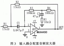 圖3所示音頻放大器采用了一種新穎的交流耦合方式,它與傳統(tǒng)的耦合電路配置相比只需要非常小的耦合電容器。圖中輸入電容器(C1)的容量僅為0.047μF。因此,我們可以采用電壓系數(shù)非常低的COG/1206陶瓷電容器這樣可以最大限度地降低電壓系數(shù)的影響。運(yùn)算放大器(必須采用低偏置電流的放大器,例如MAX4490型)的直流反饋由兩個(gè)100kΩ的電阻器(R3和R4)組成,C2和R5用來衰減直流反饋環(huán)路的音頻頻率。主要音頻反饋元件為R1、R2和C1三個(gè)無源元件。根據(jù)圖中所示的元件值,該電路的-3db截止頻率設(shè)置在5Hz。