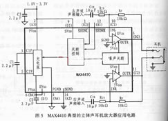 圖5所示MAX4410典型的立體聲耳機(jī)放大器應(yīng)用電路。設(shè)置輸入電容Cin等于10μF時(shí)能夠?qū)㈦娙萜麟妷合禂?shù)的影響限制到亞音頻頻率,該電路省略了大容量的輸出耦合電容器。