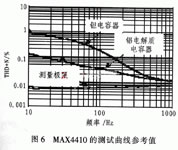 關(guān)于大容量電容器,圖6給出兩種100μF電容器和16電阻器組成的無源高通濾波器的THD+N與頻率的關(guān)系曲線。在100Hz、-3db截止頻率,兩種電容器的電壓系數(shù)均會(huì)導(dǎo)致THD指標(biāo)惡化。100μF的鉭電容器在-3db截止頻點(diǎn)THD+N指標(biāo)為0.2%。如果采用Maxim專有的DirectDrive放大器,因?yàn)槭÷粤诉@個(gè)大容易輸出耦合電容器,可大大改進(jìn)低頻和音頻質(zhì)量。在圖6所示曲線中,MAX4410測試曲線近似等于參考值。