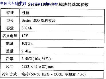 Cobasys是ChevronTexacoTechnologyVenture(美國第二大能源公司)和ECD(EnergyConversionDevices)的合資公司。ECD全資控股Ovonic,Ovonic擁有很多關(guān)于鎳氫電池方面的專利,全世界生產(chǎn)鎳氫電池的企業(yè)須得到它的許可才能生產(chǎn)銷售oCobasys不僅只是技術(shù)的研發(fā),而且把研發(fā)的技術(shù)推廣到產(chǎn)業(yè)化的水平。Cobasys專門為混合動力汽車開發(fā)8.8Ah的Series1000電池模塊。其基本參數(shù)見表3。
