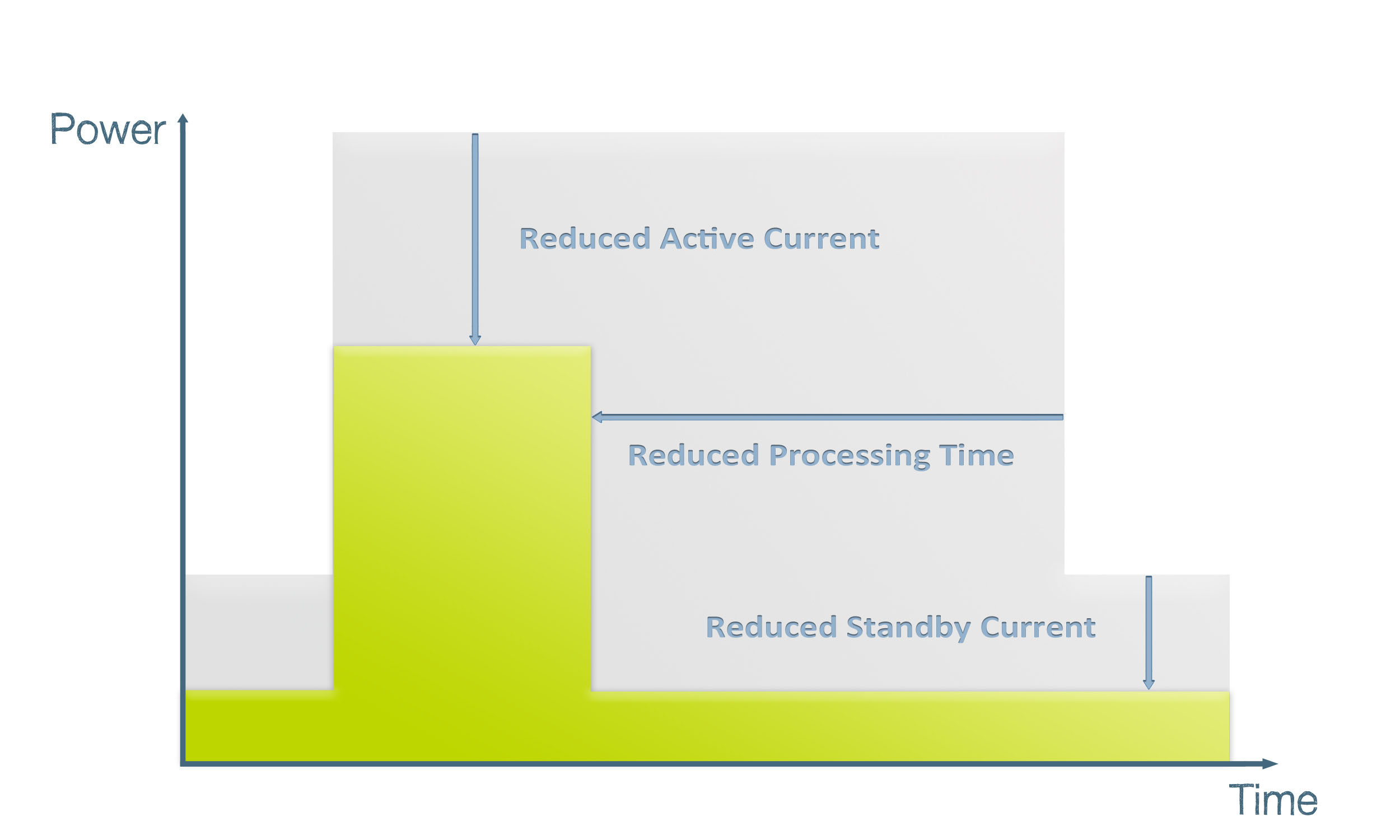 圖2:節(jié)能MCU內核通過完整的喚醒/操作/回到睡眠周期在多個不同區(qū)域節(jié)省能源。藍色區(qū)域表示一個更強大的32位內核完成任務所節(jié)省的能量,所需的周期比一個8位內核需要的少,在活躍和睡眠模式下消耗的電流也較少。