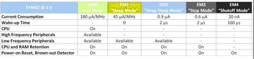 Cortex - M3的另一個顯著優(yōu)勢是它提供了先進的睡眠模式,在EFM32里得到了進一步增強。由于這些設(shè)備在睡眠模式下花掉了大多數(shù)的運行壽命,在睡眠模式下提供盡可能多的靈活度很有意義。EFM32提供5種睡眠模式, 運行模式(EM0)花費了180μA/MHz而關(guān)斷模式只花費20nA(EM4)。