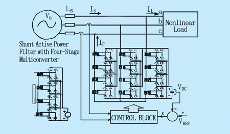 一直處于研究階段的多級(jí)逆變器,最近被用于APF拓?fù)渲?,圖11為配有三級(jí)逆變器的并聯(lián)APF,今天在大多數(shù)的逆變器應(yīng)用領(lǐng)域,三級(jí)逆變器已愈益普及,例如功率因數(shù)補(bǔ)償器。多級(jí)變換器的優(yōu)點(diǎn)是能降低APF產(chǎn)生的諧波含量。因與普通變頻器比較,能輸出更多(>2級(jí))的電壓,這一特點(diǎn)有利于減少濾波器本身產(chǎn)生的諧波。另一優(yōu)點(diǎn)是能減少半導(dǎo)體電壓或電流的定額,以及減少所需的開關(guān)頻率。