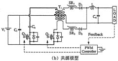 伴隨著開(kāi)關(guān)電源開(kāi)關(guān)操作時(shí)急劇的電壓和電流變化而產(chǎn)生的浪涌和噪聲將作為傳導(dǎo)噪聲或輻射噪聲傳遞至設(shè)備的外部,從而引發(fā)電磁干擾(EMI)問(wèn)題。傳導(dǎo)噪聲(特別是共模噪聲)中也時(shí)常會(huì)產(chǎn)生很大的環(huán)路電流,這是輻射噪聲的起因。近幾年來(lái),ZVS(零電壓開(kāi)關(guān))和ZCS(零電流開(kāi)關(guān))等軟開(kāi)關(guān)(SoftSwitching)技術(shù)作為抑制浪涌發(fā)生的常規(guī)方法已經(jīng)廣為人知。不過(guò),人們?cè)诖嘶A(chǔ)上又提出了多種能夠兼顧低功耗和低噪聲目標(biāo)的電路方案。圖5(a)示出了采用有源鉗位電路的傳統(tǒng)型轉(zhuǎn)換器電路。鉗位開(kāi)關(guān)Q2需要在高壓側(cè)進(jìn)行絕緣驅(qū)動(dòng),這里通常采用的是脈沖變壓器。然而,如圖5(b)所示,研究人員最近又提出了一種共源極型有源鉗位電路方案,它將兩個(gè)MOSFET開(kāi)關(guān)的源極端子共接,從而簡(jiǎn)化了柵極驅(qū)動(dòng)。不僅如此,這種共源極型電路方式還有望降低噪聲,經(jīng)實(shí)驗(yàn)測(cè)量,其噪聲電平較之傳統(tǒng)型電路下降了約30dB。