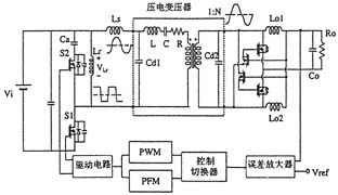 日本的研究人員開(kāi)發(fā)成功一種振動(dòng)型壓電變壓器,其厚度僅為4mm。該壓電變壓器的驅(qū)動(dòng)電路采用方波逆變器,通過(guò)改變其開(kāi)關(guān)頻率(PFM方式)以達(dá)到借助壓電變壓器的諧振特性來(lái)調(diào)整輸出電壓的目的。但是,由于壓電變壓器具有多種由其形狀所決定的諧振頻率,所以很難通過(guò)大幅度地改變頻率的做法來(lái)控制輸出電壓。為此,人們正在研究引入逆變器的脈寬調(diào)制(PWM)技術(shù)。圖7示出了通過(guò)將驅(qū)動(dòng)用逆變器、采用電流倍增器的整流電路以及采用PFM和PWM方式的混合控制電路與壓電變壓器相連而構(gòu)成的壓電變壓器DC/DC轉(zhuǎn)換器。