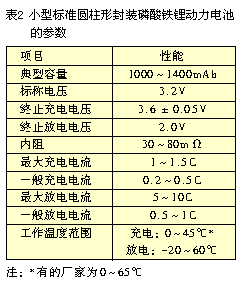 磷酸鐵鋰動(dòng)力電池的容量有較大差別,可以分成三類:小型的零點(diǎn)幾到幾毫安時(shí)、中型的幾十毫安時(shí)、大型的幾百毫安時(shí)。不同類型電池的同類參數(shù)也有一些差異。這里再介紹一種目前應(yīng)用較廣的小型標(biāo)準(zhǔn)圓柱形封裝的磷酸鐵鋰動(dòng)力電池的參數(shù)。其外廓尺寸:直徑為18mm、高650mm(型號(hào)為18650),其參數(shù)性能如表2所示。