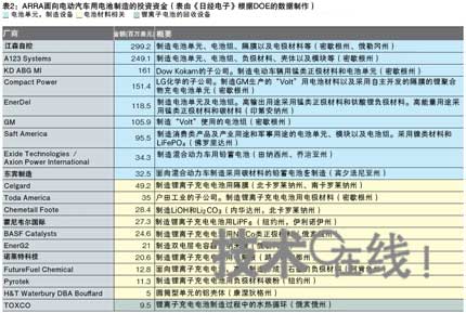 在奧巴馬政權(quán)的經(jīng)濟(jì)刺激政策“ARRA”的7872億美元中,美國能源部(DOE)將其中的14億9190萬美元用于電動車輛用充電電池的生產(chǎn)(表2)。利用該ARRA投資的條件是,接受投資的企業(yè)需要自行準(zhǔn)備與投資額大致相同的資金,因此共計(jì)有約30億美元的資金用于電池生產(chǎn)。