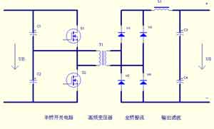 DC/DC功率變換器采用半橋電路拓?fù)洌β势骷?,控制簡單,可靠性高。如圖5所示,采用MOSFET和IGBT并聯(lián)技術(shù),充分利用了MOSFET開關(guān)速度快和IGBT導(dǎo)通壓降低的優(yōu)點(diǎn)。在電路上采取措施,使得MOSFET的關(guān)斷時間比IGBT延遲一定的時間,大大減小了IGBT的電流拖尾,降低了開關(guān)通態(tài)損耗,提高了效率和可靠性,使得半橋電路的輸出功率可以實(shí)現(xiàn)7kW。其輸出側(cè)采用的整流方式有半波整流,中心抽頭全波整流及全橋整流。由于輸出電壓較高,全橋整流對變壓器利用率高,比較適合用于這種場合。