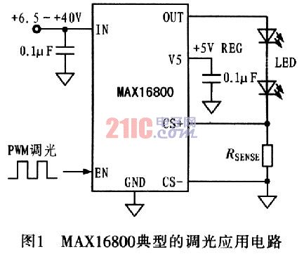 圖1為MAXl6800典型的調光應用電路。MAXl6800具有高輸入電壓范圍(達40V),可直接連接到汽車電池而不需要保護器件,保護器件一般用來抵御電池負載變化帶來的浪涌電壓。MAxl6800能夠為LED提供恒定電流,電流值可以通過與LED串聯(lián)的檢流電阻RSENSE設置。為了提高電流設置精度,提高對外部噪聲的抑制能力,MAXl6800采用差分電流檢測輸入方式。