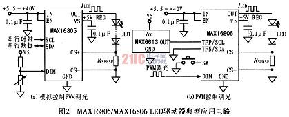由于很多照明系統(tǒng)沒有可利用的微控制器產(chǎn)生PWM調光信號,因此可采用MAXl6805/MAXl6806型LED驅動器。這兩款器件均由內部產(chǎn)生PWM信號,PWM信號由加在DIM輸入引腳的外部模擬電壓設置。不采用模擬調光時,MAXl6806有一個開關輸入(SW),該開關輸入不僅檢測開關狀態(tài),并具有去抖功能,為開關提供濕電流。圖2為MAXl6805/MAXl6806典型應用電路。