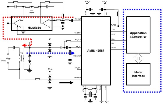 藍(lán)色箭頭表示接收路徑。變壓器從電力線(xiàn)耦合過(guò)來(lái)的信號(hào)經(jīng)AMIS-49587內(nèi)置放大器構(gòu)成的低通濾波器由內(nèi)部ARM進(jìn)行FSK解調(diào)分析。圖中黑色箭頭是50Hz的過(guò)零檢測(cè)信號(hào)引腳。系統(tǒng)依靠這個(gè)信號(hào)進(jìn)行同步定時(shí)。圖中藍(lán)色虛線(xiàn)內(nèi)是電表內(nèi)的應(yīng)用處理器,負(fù)責(zé)應(yīng)用層處理通信及計(jì)量?! ?br />