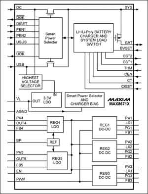 因?yàn)镸AX8671X可以無(wú)縫管理USB和交流適配器電源,使得制造商能夠省去AC/DC墻上適配器充電零配件,從而降低了系統(tǒng)成本。其集成了眾多功能:電池充電器、適配器-USB-電池開(kāi)關(guān)、系統(tǒng)電壓調(diào)節(jié)以及各種檢測(cè)功能(見(jiàn)圖1)。5路獨(dú)立的集成穩(wěn)壓器(3路2MHz開(kāi)關(guān)降壓型調(diào)節(jié)器,效率高達(dá)96%;2路低靜態(tài)電流的線性穩(wěn)壓器)可以為多個(gè)子系統(tǒng)提供高效供電。