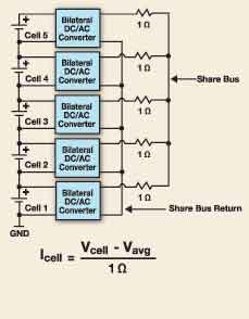 Aeroflex平衡電路使用共享總線,這個(gè)總線的電壓等于所有電池的平均電壓。平衡電路由那些超過共享總線電壓的電池充電并將電能注入到電壓較低的電池,這個(gè)工作是通過高效率的雙邊DC/AC轉(zhuǎn)換器來完成的。