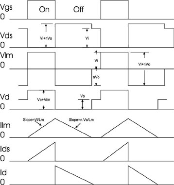 盡管可采用電感器,但所示設(shè)計(jì)采用的是未隔離的變壓器。隔離設(shè)計(jì)在離線設(shè)備中更為常見,在離線設(shè)備中,變壓器具有隔離作用,可方便地實(shí)現(xiàn)占空比調(diào)整。反激式開關(guān)電源可在非連續(xù)導(dǎo)通和連續(xù)導(dǎo)通兩種模式下工作,不連續(xù)導(dǎo)通模式如圖2所示。Ilm和Vlm是變壓器磁化電感通過(guò)的電流和施加的電壓。