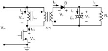 [page]當(dāng)開關(guān)閉合時(shí),電壓施加在變壓器初級(jí)的兩端,因?yàn)榇藭r(shí)次級(jí)二極管是截止的,變壓器所起的作用就像電感器。經(jīng)過(guò)初級(jí)線圈的電流會(huì)上升,同時(shí)能量?jī)?chǔ)存在磁通量中。當(dāng)開關(guān)斷開時(shí),次級(jí)二極管導(dǎo)通,電流通過(guò)次級(jí)時(shí)會(huì)下降,因?yàn)槟芰勘晦D(zhuǎn)換至次邊大容量電容器。如果電流經(jīng)過(guò)磁化電感區(qū)后降至零,這是不連續(xù)導(dǎo)通模式。如果磁化電流未降至零,如圖3所示,則系統(tǒng)以連續(xù)導(dǎo)通模式工作。