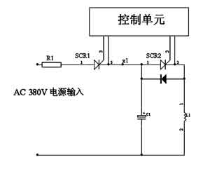 控制原理是:首先通過380V交流電給C1充電,正半周SCR1導(dǎo)通,完成充電過程,負(fù)半周SCR1自動截止,C1電壓一直保持到下一個正半周期信號到來。此時開通SCR2,使C1、L1形成回路,產(chǎn)生自由震蕩并完成放電。如此反復(fù)循環(huán),即達(dá)到了理想的磁場波形。