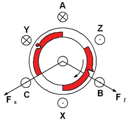 得知Hall輸出信號與轉(zhuǎn)子磁動勢位置的關(guān)系之后,可以產(chǎn)生正六邊形的旋轉(zhuǎn)磁場,如圖4所示,AB相繞組通電,產(chǎn)生圖中合成磁勢Fa,由于Fa的牽引,F(xiàn)f將會順時針旋轉(zhuǎn),旋轉(zhuǎn)到X位置后,換成給AC相通電,則Fa順時針跳躍60°電角度,牽引Ff順時針旋轉(zhuǎn)60°,依次類推,通電順序按照AB-AC-BC-BA-CA-CB-AB循環(huán),則帶動永磁轉(zhuǎn)子順時針旋轉(zhuǎn)。這就是傳統(tǒng)的方波控制方式。