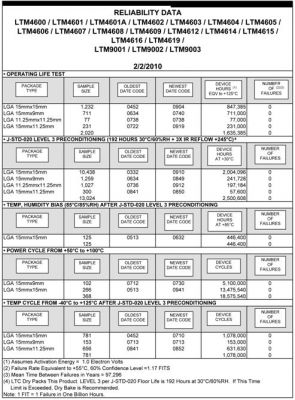 總共就DC/DC微型模塊產(chǎn)品進(jìn)行了18項(xiàng)測(cè)試,其中有幾項(xiàng)測(cè)試是在不同溫度情況下進(jìn)行的。這些數(shù)據(jù)是累計(jì)的,即自這些產(chǎn)品3年半以前推出以來(lái),凌力爾特公司一直在監(jiān)視和更新這些數(shù)據(jù)。凌力爾特公司嚴(yán)格更新這份報(bào)告,而且可在線提供報(bào)告副本。要求報(bào)告副本并無(wú)需滿足任何特殊要求。凌力爾特公司以這種方式支持其高性能微型模塊產(chǎn)品線,其中包括DC/DC系列(除了DC/DC產(chǎn)品,還提供混合信號(hào)微型模塊器件,如LTM9003和LTM2881)。