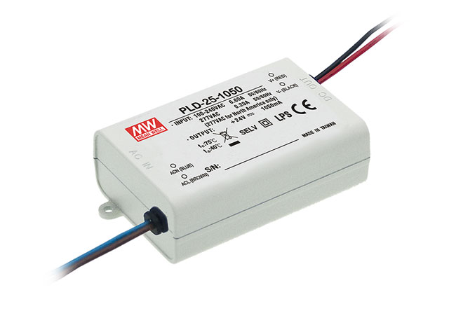 明緯繼完成了LPHC/LPLC-18(18W)、LPC-20(20W)、LPC-35(35W)、LPC-60(60W)等恒流式無PFC系列機種后,新推出了一款25W交流/直流具功率因子矯正(PFC)功能之塑料機殼型恒流式LED電源供應器~PLD-25系列,以滿足需求低瓦數(shù)具PFC功能之室內(nèi)LED照明/裝飾光源相關應用。PLD-25可接受90~295VAC交流輸入,除了可使用于一般115VAC或230VAC市電地區(qū),亦適用于北美地區(qū)277VAC之電力系統(tǒng)。