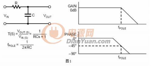 數(shù)學(xué)上,在傳輸方程式中,當(dāng)分母為零時(shí)會(huì)產(chǎn)生一個(gè)極點(diǎn)。在圖形上,當(dāng)增益以20dB每十倍頻的斜率開始遞減時(shí),在博得圖上會(huì)產(chǎn)生一個(gè)極點(diǎn)。圖1舉例說(shuō)明一個(gè)低通濾波器通常在系統(tǒng)中產(chǎn)生一個(gè)極點(diǎn)。其傳輸函數(shù)和博得圖也一并給出。