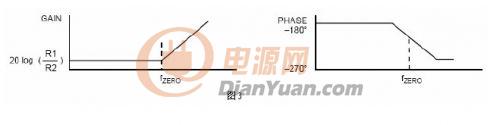零點(diǎn)是頻域范圍內(nèi)的傳輸函數(shù)當(dāng)分子等于零時(shí)產(chǎn)生的。在博得圖中,零點(diǎn)發(fā)生在增益以20dB每十倍頻的斜率開始遞增的點(diǎn),并伴隨有90度的相位超前。圖2描述一個(gè)由高通濾波器電路引起的零點(diǎn)。