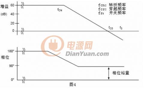 增益帶寬是指單位增益時(shí)的頻率,見(jiàn)圖4,增益帶寬就是穿越頻率Fcs。最大穿越頻率的主要限制因素是電源的開關(guān)頻率。根據(jù)采樣定理,如果采樣頻率小于2倍信號(hào)頻率(更嚴(yán)謹(jǐn)一點(diǎn)的說(shuō)法是應(yīng)該小于2倍最大信號(hào)頻率,譯注),則被采樣的信息就不能被完全讀取。