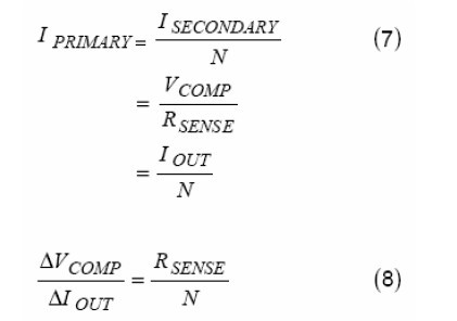 從ISECONDARY以后(見(jiàn)圖9),副邊電流或者說(shuō)輸出電流與主邊電流成比例,把等式(4)重新排列表示出副邊電流與VCOMP之間的關(guān)系。