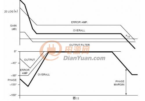 因?yàn)檫@是一個(gè)線性系統(tǒng),可以用疊加的方法得到整個(gè)系統(tǒng)的傳輸函數(shù)。通過(guò)把整個(gè)環(huán)路各部分的增益和相位疊加起來(lái),產(chǎn)生整個(gè)系統(tǒng)的博得圖。通過(guò)放置補(bǔ)償網(wǎng)絡(luò)的極點(diǎn)和零點(diǎn)使系統(tǒng)的性能最優(yōu)化。圖11把各部分的博得圖結(jié)合起來(lái),負(fù)反饋系統(tǒng)的180度相移也加入進(jìn)來(lái)了。