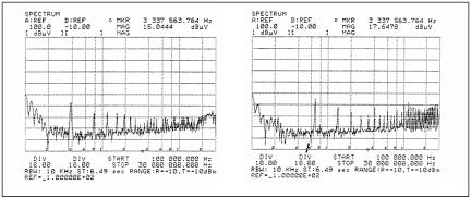 圖1–帶共模扼流圈的零電流開關(guān)轉(zhuǎn)換器(圖左)和帶濾波器的脈寬調(diào)制轉(zhuǎn)換器(圖右)的傳導(dǎo)輸入噪聲頻譜。