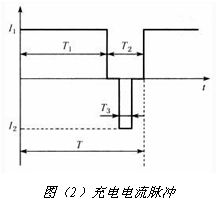快速充電器根據(jù)實時檢測到的電池組的端電壓、充電電流、溫度、動態(tài)內阻等信息,按照馬斯充電定律,通過采用智能控制算法實施對充電電流脈沖寬度T1、間歇時間T2、放電電流脈沖T3的分段調節(jié),以消除被充電電池組的電極化現(xiàn)象,使電池組時刻處于較佳的電流接受狀態(tài),提高充電速度和充電效率。具體控制過程是,首先用較寬的充電脈沖進行充電,蓄電池的端電壓上升,當?shù)竭_充電時間T1時,充電器暫停充電,當充電間歇時間達到T2時充電器繼續(xù)充電,如此反復,如圖(2)所示。