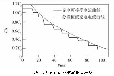 其次,分段恒流充電智能化控制技術通過減小各段恒流值下降梯度(分段數(shù)增加),可使實際充電電流曲線更接近充電可接受電流曲線。通過試驗確定該型電池初次恒流值I(1),并減小階段恒流充電的電流下降幅度。如果降低充電電流后,達到充電終止容量梯度值的時間很短 (設定一個最小充電時間),則適當增大電流下降的幅度。分段恒流充電電流曲線如圖(4)所示。
