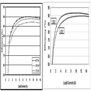 Maxim電源部制作了一款基于MAX5051的隔離電源模塊,圖2是詳細(xì)的電氣原理圖。我們將該電源模塊與市場(chǎng)上流行的電流模式同步整流推挽電源模塊(這里我們稱(chēng)其為非定制模塊)進(jìn)行了比較,從所測(cè)試的效率曲線(圖3)可以看出,基于MAX5051的模塊效率明顯提高。輕載時(shí),比如1A輸出負(fù)載,MAX5051模塊電源的效率大于62%,而非定制模塊的效率則小于58%。在輸出功率為半載時(shí)(7.5A),MAX5051模塊效率為92%,非定制模塊效率是88%。滿(mǎn)功率負(fù)載時(shí),MAX5051模塊電源的效率仍比非定制模塊效率高出4%。從效率曲線對(duì)比,可以得出雙管正激電路能夠更好的滿(mǎn)足模塊電源高效率的要求。