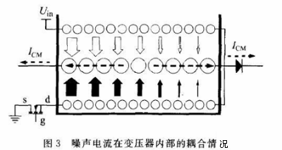 圖l中的共模電流, 在電路中的耦合途徑主要有3條:從噪聲源—— 功率開(kāi)關(guān)管的d極通過(guò)C耦合到地;從噪聲源通過(guò)c。 耦合到變壓器次級(jí)電路,再通過(guò)C 耦合到地;從變壓器的前、次級(jí)線圈通過(guò)C?C 耦合到變壓器磁芯,再通過(guò)C 耦合到地。這3種電流是構(gòu)成共模噪聲電流(圖1中的黑色箭頭所示)的主要因素。共模電流通過(guò)電源線輸入端的地線回流,從而被LISN取樣測(cè)量得到。