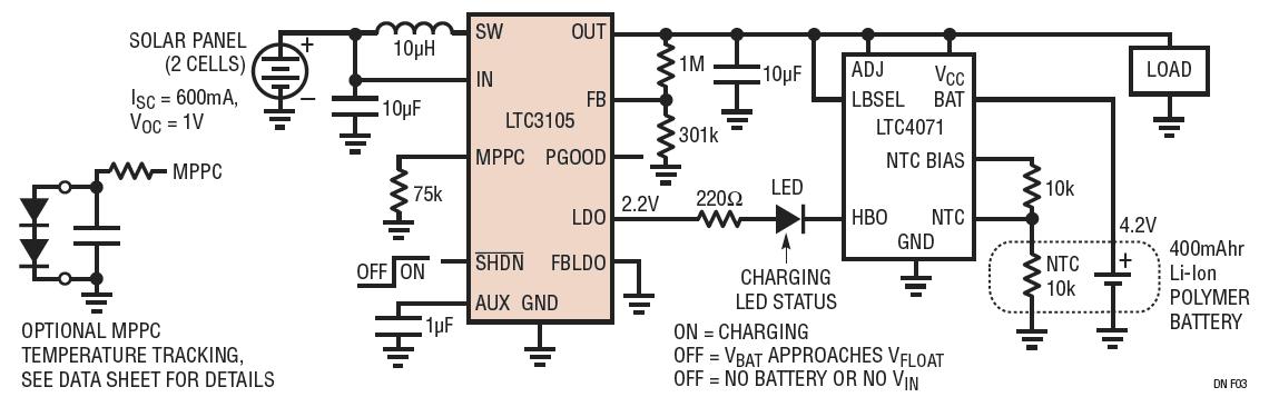 雖然本文描述的電路僅可產(chǎn)生幾百 mW 的功率,但它卻能夠在大多數(shù)天氣條件下提供足以使一個(gè) 400mAhr 鋰離子電池保持滿充電狀態(tài)的功率。低輸入電壓與輸入功率控制相結(jié)合,使得 LTC3105 成為低功率太陽(yáng)能應(yīng)用的理想選擇。此外,LTC4071 并聯(lián)充電系統(tǒng)還通過(guò)提供精準(zhǔn)浮置電壓、充電狀態(tài)和溫度安全特性而對(duì) LTC3105 給予了補(bǔ)充,可在室外環(huán)境中確保長(zhǎng)久的電池使用壽命。