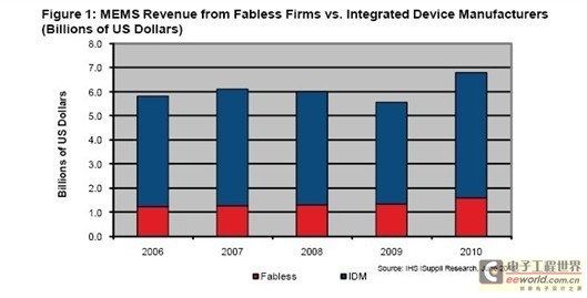 圖所示為2006-2010年IDM與無晶圓制造半導(dǎo)體公司的MEMS營業(yè)收入。