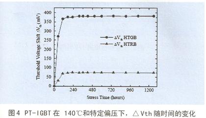 。圖4給出PT—IGBT(IRG4BC20F)在(1)柵已射極Gge=20V,Vce=OV(HTGB)和(2)Vge=0V,Vce=0.8V(HTRB)在140℃,經過1200小時的應力試驗結果。由圖4中的HTGB曲線可見,柵偏置試驗開始后100小時內,