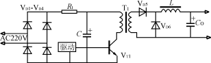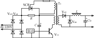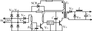 該電路如圖3所示。在電源瞬時(shí)接通時(shí),輸入電壓經(jīng)整流橋VD1VD4和限流電阻R對(duì)電容器C充電。當(dāng)電容器C充電到約80%的額定電壓時(shí),逆變器正常工作,經(jīng)主變壓器輔助繞組產(chǎn)生晶閘管的觸發(fā)信號(hào),使晶閘管導(dǎo)通并短路限流電阻R,開關(guān)電源處于正常運(yùn)行狀態(tài)。