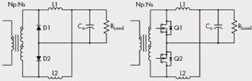 從拓?fù)涞慕嵌葋砜矗秸髌鞯膫鲗?dǎo)損耗和開關(guān)損耗都更低,能夠提高這些轉(zhuǎn)換級的效率,因而是開關(guān)模式電源次級端的基本構(gòu)建模塊,在服務(wù)器電源或電信整流器等低壓及大電流應(yīng)用中非常流行。如圖1所示,它取代了肖特基整流器,可使電壓降變得更小。從器件角度來看,過去十年中,功率MOSFET晶體管的進(jìn)展巨大,催生出了新穎的拓?fù)浜透吖β拭芏入娫础?0世紀(jì)早期平面技術(shù)問世之后,中低電壓MOSFET迅速被開發(fā)出來,利用溝槽柵技術(shù)來大幅提高性能。溝槽柵MOSFET是中低電壓電源應(yīng)用的首選功率器件,其把一個柵極結(jié)構(gòu)嵌入到精心蝕刻在器件結(jié)構(gòu)上的溝槽區(qū)域中。這種新技術(shù)可以提高溝槽密度,并無需JFET阻抗元件,因此能夠使特征導(dǎo)通阻抗降低30%左右。當(dāng)MOSFET的導(dǎo)通阻抗與漏極電流的乘積小于二極管正向電壓降時,同步整流的能量損耗降低。