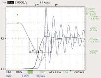 在反向恢復(fù)電流波形中,從零到峰值反向電流的這段時間被稱為ta。tb則定義為從峰值回到零的時間。軟度因子定義為tb/ta。一個軟器件的軟度因子大于1,而當(dāng)其軟度因子小于1時,該器件被認(rèn)為是“snappy(活躍的)”。從圖10可看出,反向恢復(fù)期間snappy二極管的峰值電壓較大。當(dāng)所有條件都相同時,snappy二極管的電壓尖刺總是比較高,因此會在緩沖電路中造成額外的損耗。輕載條件下,這一點可能比把導(dǎo)通阻抗RDS(on)減小1毫歐還要來得重要。圖11所示為諧振頻率為400kHz的500W PSFB DC-DC轉(zhuǎn)換器中軟器件與snappy器件的工作波形。軟器件的峰值電壓比snappy器件的小10%,從而可使緩沖電路的功耗降低30%,系統(tǒng)效率提高0.5%。盡管軟器件的RDS(on)比snappy器件的要高25%,但在20%負(fù)載條件下,二者的效率分別為94.81%與94.29%。滿載下兩個器件的效率相同。
