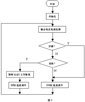 在此硬件電路的基礎(chǔ)上,結(jié)合單片機(jī)的控制系統(tǒng)可檢測(cè)輸出電壓低于某一設(shè)定值時(shí),單片機(jī)便認(rèn)為負(fù)載電弧是處于短路狀態(tài),這時(shí)單片機(jī)便對(duì)IGBT的最小脈沖寬度進(jìn)行限制,以保證吸收電容有足夠的放電時(shí)間,從而降低IGBT的關(guān)斷反向電壓。同時(shí)為保證輸出電流恒定,單片機(jī)在判斷輸出為短路時(shí)將逆變器的等脈沖寬度調(diào)節(jié)(PWM)變?yōu)轭l率調(diào)節(jié)控制(PFM),即脈沖分頻控制,輸出電壓越低,輸出脈沖的頻率越低。其單片機(jī)程序過程如圖5所示: