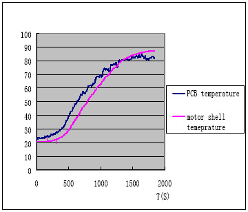 用上文所述的PPTC設(shè)計(jì)流程可以用在多功能豆?jié){機(jī)馬達(dá)防堵保護(hù)設(shè)計(jì)中,但這是往往會(huì)碰到選擇PPTC型號(hào)困難的問題,也就是說(shuō)多功能豆?jié){機(jī)的馬達(dá)保護(hù)設(shè)計(jì)會(huì)較普通的小家電馬達(dá)保護(hù)復(fù)雜的多,圖4為磨制豆?jié){時(shí)PCB板周圍環(huán)境溫度和馬達(dá)外殼溫度的實(shí)測(cè)圖,可見控制電路PCB板PPTC周圍的環(huán)境溫度最高可以到達(dá)85C。由于豆?jié){機(jī)的PPTC最高環(huán)境溫度85度會(huì)比普通的小家電最高環(huán)境溫度要求高,這樣既要在85度的最大工作電流下能正常工作,還要保證在最低溫度0度的堵轉(zhuǎn)電流情況下能及時(shí)的保護(hù),相應(yīng)的就增大了設(shè)計(jì)難度。下面就具體的闡述此類多功能豆?jié){機(jī)馬達(dá)堵轉(zhuǎn)的保護(hù)設(shè)計(jì)方案?!?br />