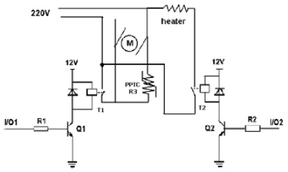 下圖3為多功能豆?jié){機(jī)馬達(dá)和加熱器的簡(jiǎn)單電路示意圖。豆?jié){機(jī)所用馬達(dá)為220V直流馬達(dá),繼電器的工作電壓為12V,豆?jié){機(jī)利用繼電器把MCU發(fā)出的低壓控制信號(hào)I/O來(lái)控制交流高壓信號(hào)的通斷,R3為PPTC可恢復(fù)電阻,T1和T2為繼電器。