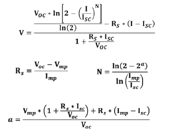 為了能夠精確仿真太陽能電池板在特定環(huán)境條件下的輸出(特別是對于小功率逆變器,仿真精度的要求往往更高),很多廠家推出了專用的太陽能方陣模擬器,用于模擬各種環(huán)境下太陽能電池板的輸出特性,精確地復(fù)現(xiàn)出不同環(huán)境條件下的I-V輸出特性曲線。I-V曲線的數(shù)據(jù)多來自于用戶對太陽能電池板輸出的實(shí)際測量結(jié)果。為了簡化操作,目前國際上通用的曲線設(shè)置方式是:通過I-V曲線上的四個特征值,即Voc(開路電壓值)、Isc(短路電流值)、Vmp(最大功率點(diǎn)電壓值)、Imp(最大功率點(diǎn)電流值)來擬合得到完整的I-V曲線。所使用到的公式如下所示: